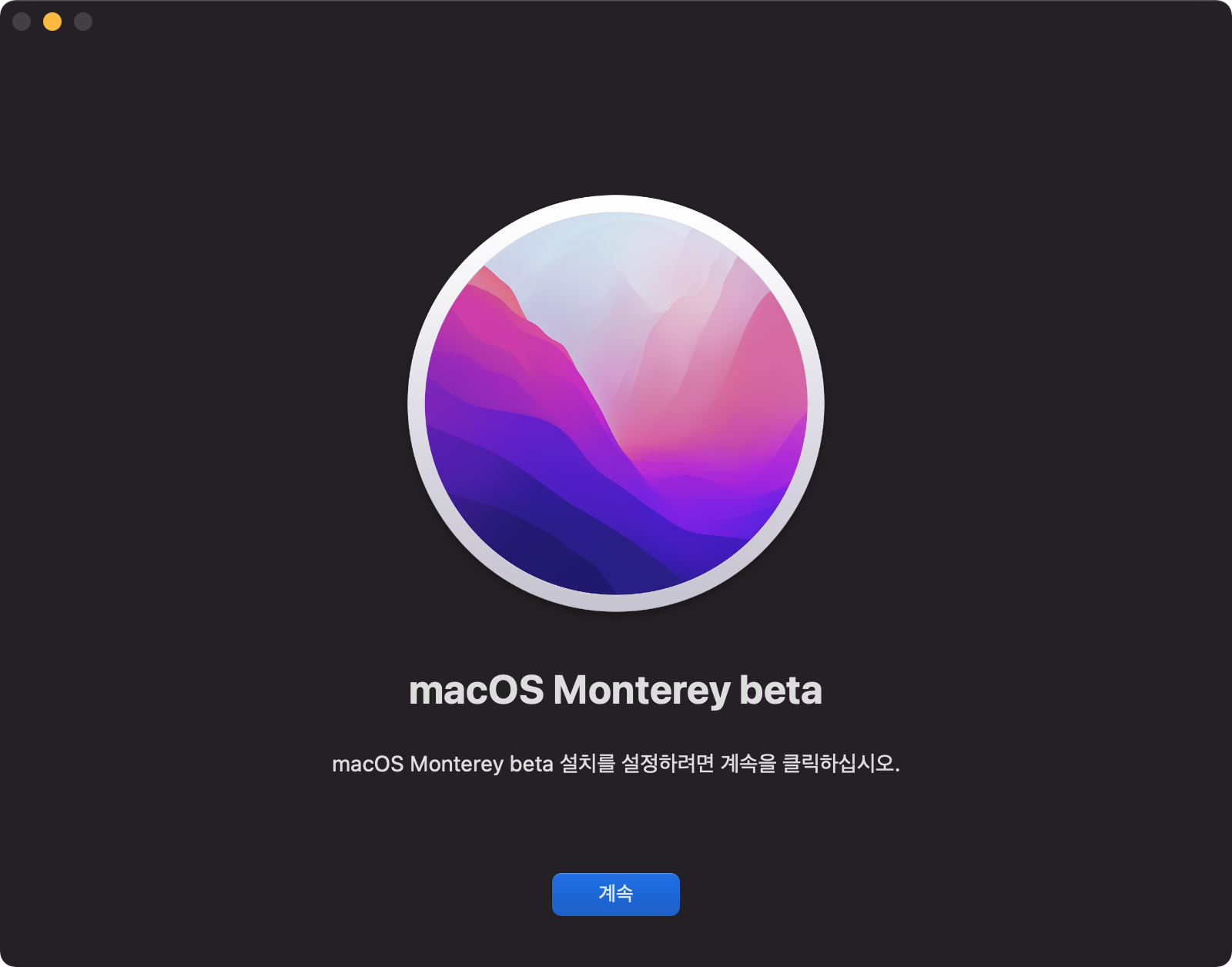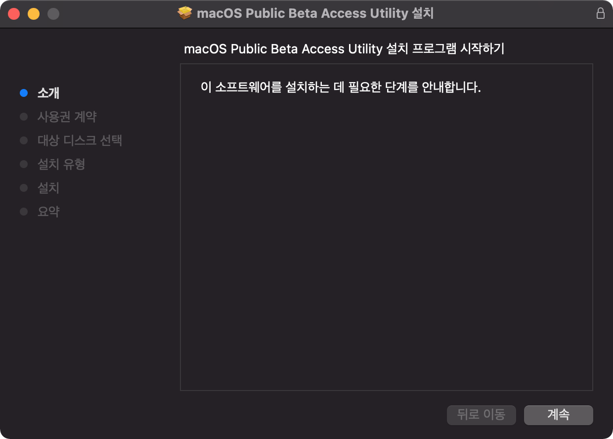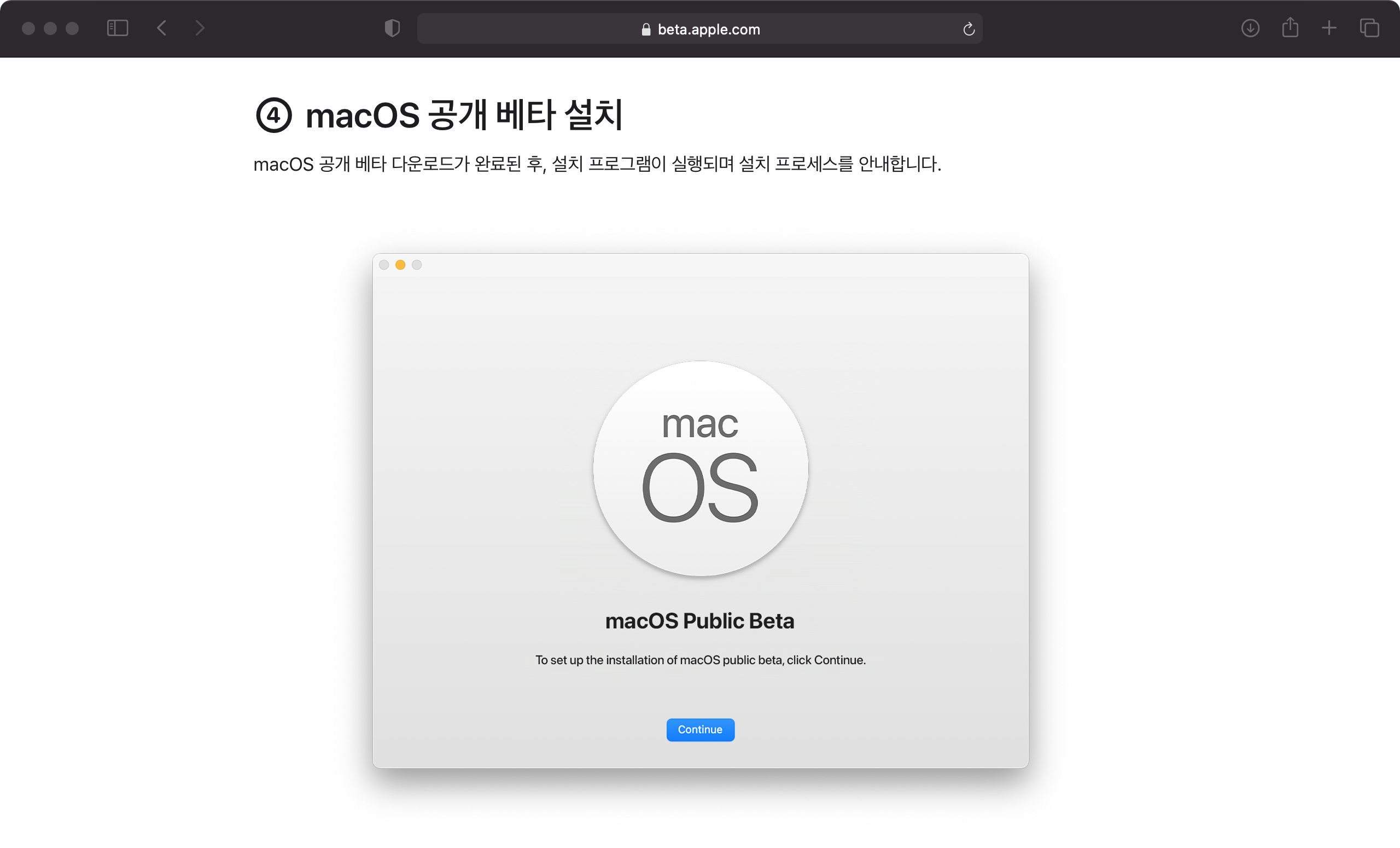 macOS 공개 베타 프로그램 다운로드가 완료되면 [계속] 버튼을 클릭하여 설치를 진행합니다.