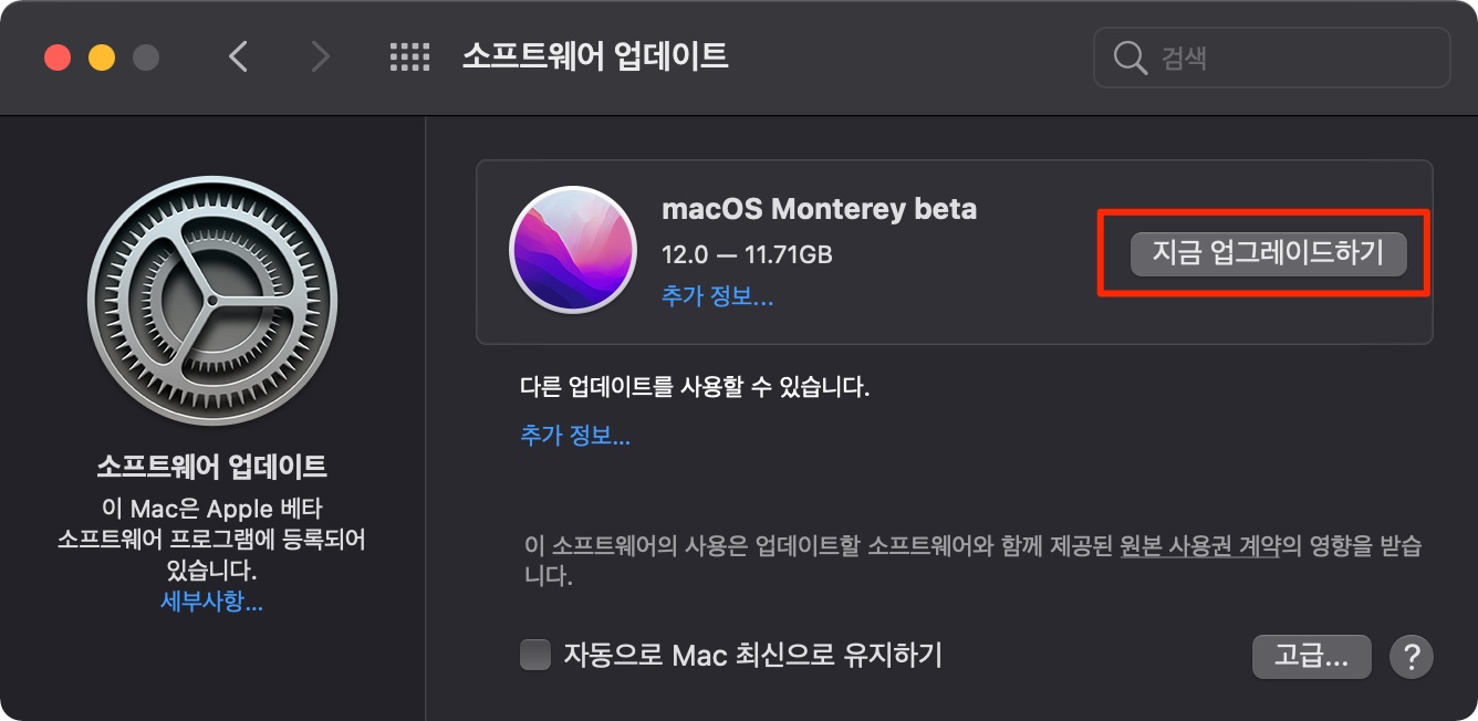 [macOS 공개 베타 액세스 유틸리티]를 설치하면 자동으로 환경설정의 소프트웨어 업데이트에서 사용자에게 mac 공개 베타로 업그레이드 할지를 묻습니다.